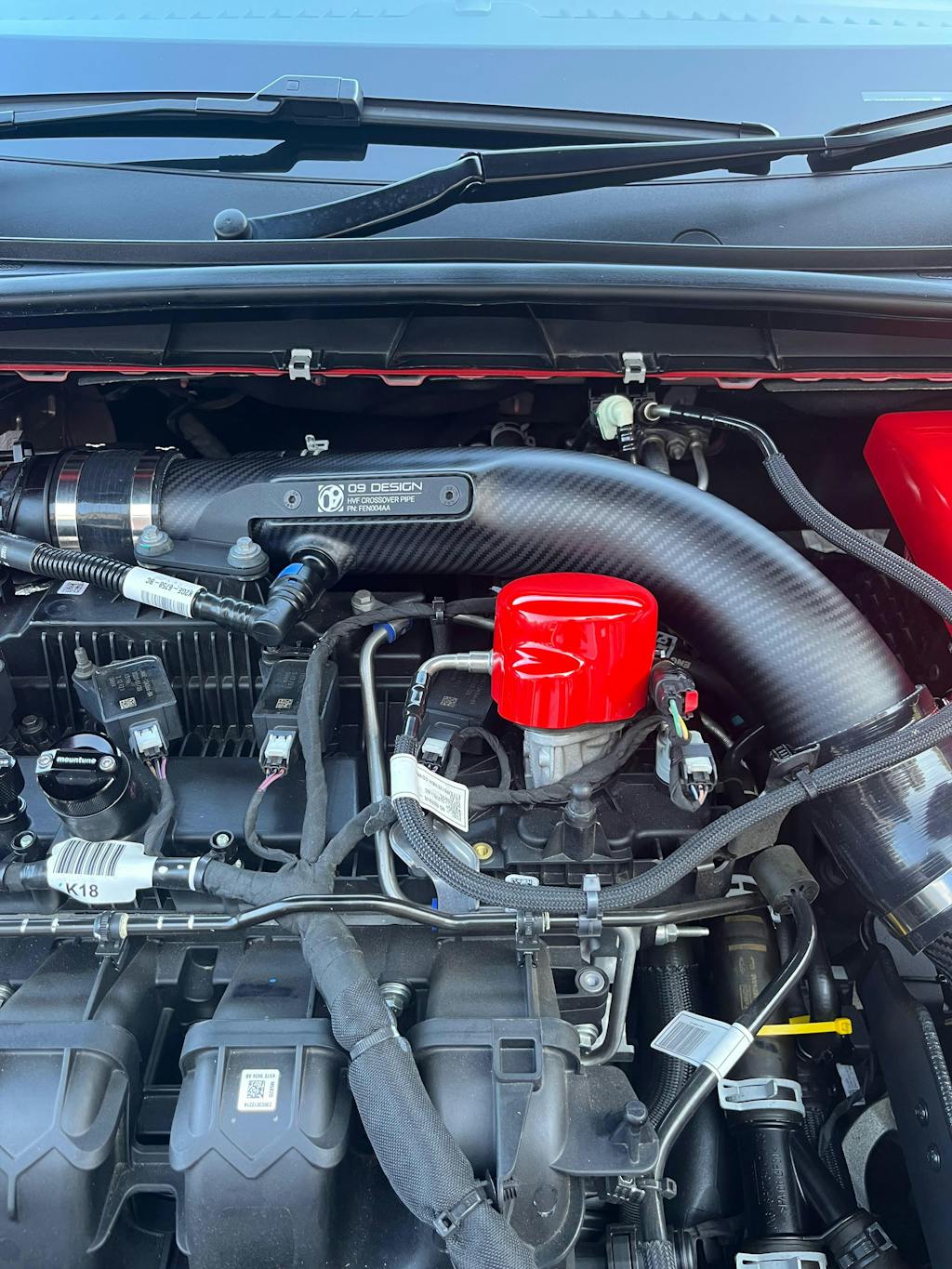 The ZERONINE DESIGN HFW (High Volume Flow) carbon fibre crossover pipe replaces the OE unit with a free-er flowing, heat-resistant unit which not only boosts airflow, but also significantly enhances engine bay aesthetics and induction noise.